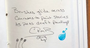 micro poem · Writing Story 2018-08-162020-11-22 CandyH2O Brushes glide across canvases to paint stories as pens draft paintings Share this: Click to share on X (Opens in new window) X Click to share on Facebook (Opens in new window) Facebook Like Loading... Related Published by CandyH2O Author/Writer, FreeThinker, Veteran 🇺🇸 USN Intelligence, Warrior, Dog lover, and just for fun, Watercolorist (hobby). View all posts by CandyH2O Share this: Click to share on X (Opens in new window) X Click to share on Facebook (Opens in new window) Facebook Like Loading...
