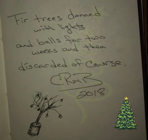 micro poem · Nature Discarded 2018-12-272020-11-22 CandyH2O Fir trees donned with lights and balls for two weeks, and then discarded of course. Share this: Click to share on X (Opens in new window) X Click to share on Facebook (Opens in new window) Facebook Like Loading... Related Published by CandyH2O Author/Writer, FreeThinker, Veteran 🇺🇸 USN Intelligence, Warrior, Dog lover, and just for fun, Watercolorist (hobby). View all posts by CandyH2O Share this: Click to share on X (Opens in new window) X Click to share on Facebook (Opens in new window) Facebook Like Loading...