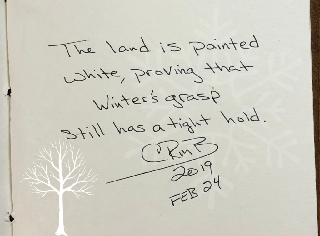 micro poem · Nature Winter’s Grasp 2019-02-252020-11-22 CandyH2O The land is painted white, proving that Winter’s grasp still has a tight hold. __________ Share this: Click to share on X (Opens in new window) X Click to share on Facebook (Opens in new window) Facebook Like Loading... Related Published by CandyH2O Author/Writer, FreeThinker, Veteran 🇺🇸 USN Intelligence, Warrior, Dog lover, and just for fun, Watercolorist (hobby). View all posts by CandyH2O Share this: Click to share on X (Opens in new window) X Click to share on Facebook (Opens in new window) Facebook Like Loading...