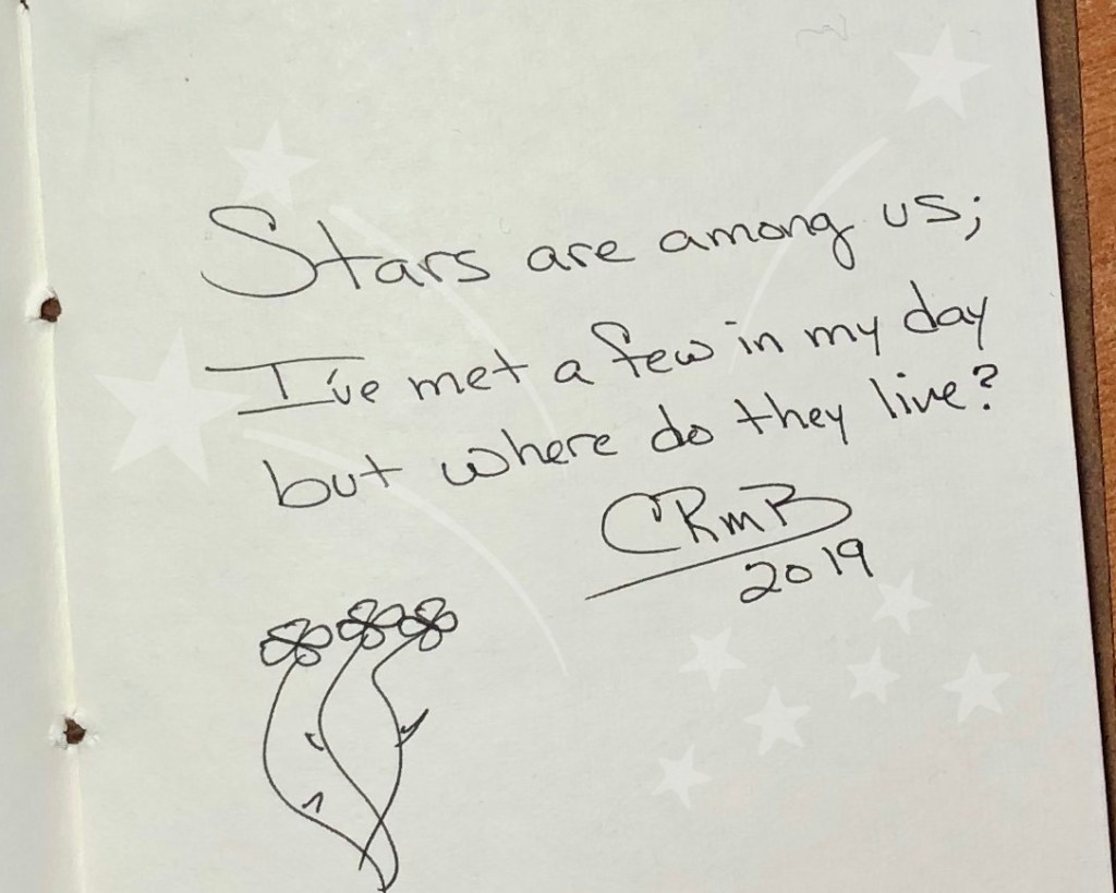 Life · micro poem Stars 2019-03-042020-11-22 CandyH2O Stars are among us; I’ve met a few in my day but where do they live? __________ Share this: Click to share on X (Opens in new window) X Click to share on Facebook (Opens in new window) Facebook Like Loading... Related Published by CandyH2O Author/Writer, FreeThinker, Veteran 🇺🇸 USN Intelligence, Warrior, Dog lover, and just for fun, Watercolorist (hobby). View all posts by CandyH2O Share this: Click to share on X (Opens in new window) X Click to share on Facebook (Opens in new window) Facebook Like Loading...
