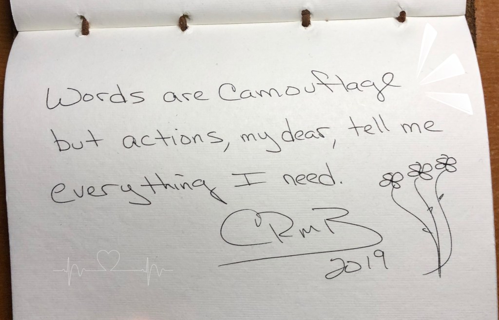 Life · micro poem Actions 2019-06-242020-11-22 CandyH2O Words are camouflage but actions, my dear, tell me everything I need. __________ Share this: Click to share on X (Opens in new window) X Click to share on Facebook (Opens in new window) Facebook Like Loading... Related Published by CandyH2O Author/Writer, FreeThinker, Veteran 🇺🇸 USN Intelligence, Warrior, Dog lover, and just for fun, Watercolorist (hobby). View all posts by CandyH2O Share this: Click to share on X (Opens in new window) X Click to share on Facebook (Opens in new window) Facebook Like Loading...