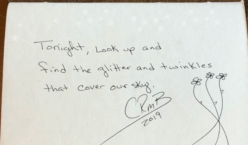 micro poem · Nature The Glitter 2019-10-212019-10-20 CandyH2O Tonight, look up and find the glitter and twinkles that cover our sky. Share this: Click to share on X (Opens in new window) X Click to share on Facebook (Opens in new window) Facebook Like Loading... Related Published by CandyH2O Author/Writer, FreeThinker, Veteran 🇺🇸 USN Intelligence, Warrior, Dog lover, and just for fun, Watercolorist (hobby). View all posts by CandyH2O Share this: Click to share on X (Opens in new window) X Click to share on Facebook (Opens in new window) Facebook Like Loading...
