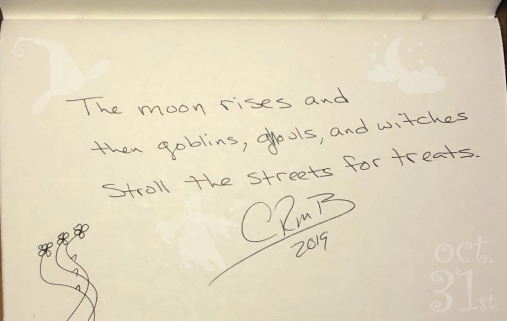 Life · micro poem Treats 2019-10-312020-11-22 CandyH2O The moon rises and then goblins, ghouls, and witches stroll the streets for treats. Happy Halloween ! Stay safe out there. Share this: Share on X (Opens in new window) X Share on Facebook (Opens in new window) Facebook Like Loading... Related Published by CandyH2O Author/Writer, FreeThinker, Veteran 🇺🇸 USN Intelligence, Warrior, Dog lover, and just for fun, Watercolorist (hobby). View all posts by CandyH2O Share this: Share on X (Opens in new window) X Share on Facebook (Opens in new window) Facebook Like Loading...