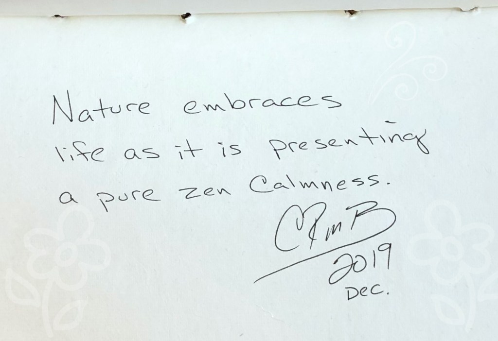 micro poem · Nature Zen 2019-12-052020-11-22 CandyH2O Nature embraces life as it is — presenting a pure zen calmness. Share this: Click to share on X (Opens in new window) X Click to share on Facebook (Opens in new window) Facebook Like Loading... Related Published by CandyH2O Author/Writer, FreeThinker, Veteran 🇺🇸 USN Intelligence, Warrior, Dog lover, and just for fun, Watercolorist (hobby). View all posts by CandyH2O Share this: Click to share on X (Opens in new window) X Click to share on Facebook (Opens in new window) Facebook Like Loading...