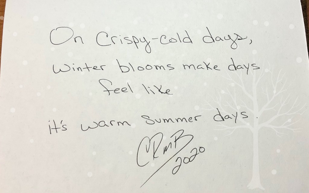 micro poem · Nature Crispy-Cold 2020-01-202020-11-22 CandyH2O On crispy-cold days, winter blooms make days feel like it’s warm summer days. Share this: Click to share on X (Opens in new window) X Click to share on Facebook (Opens in new window) Facebook Like Loading... Related Published by CandyH2O Author/Writer, FreeThinker, Veteran 🇺🇸 USN Intelligence, Warrior, Dog lover, and just for fun, Watercolorist (hobby). View all posts by CandyH2O Share this: Click to share on X (Opens in new window) X Click to share on Facebook (Opens in new window) Facebook Like Loading...