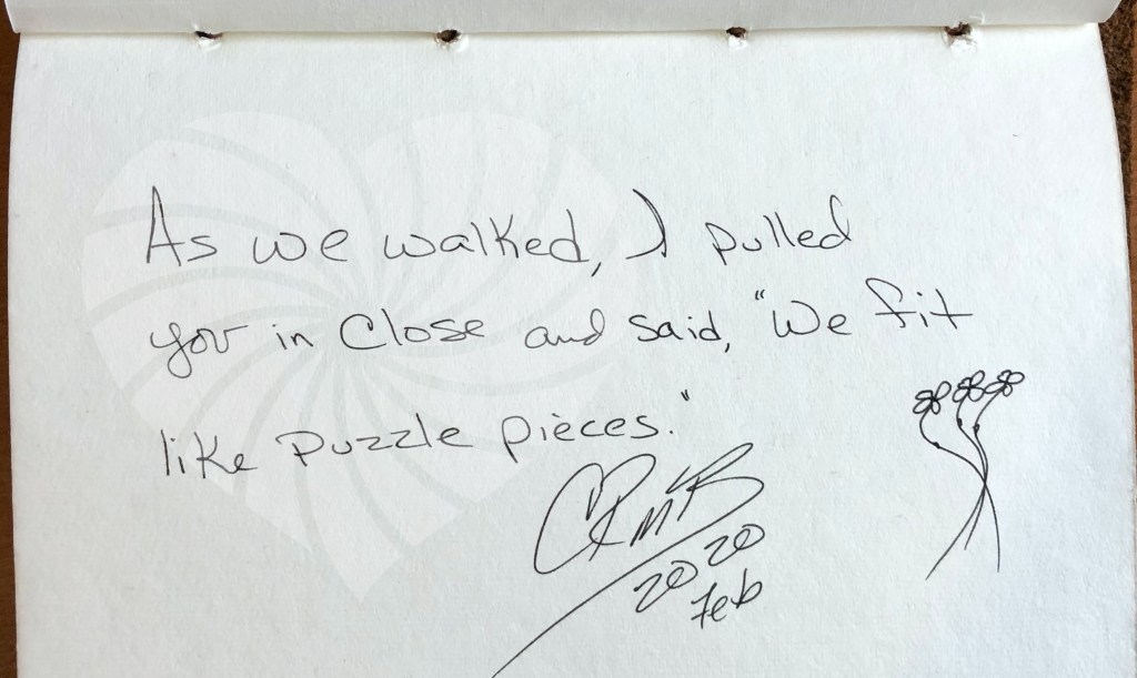 Love · micro poem Puzzle Pieces 2020-02-172020-11-22 CandyH2O As we walked, I pulled you in close and said, “We fit like puzzle pieces.” Share this: Click to share on X (Opens in new window) X Click to share on Facebook (Opens in new window) Facebook Like Loading... Related Published by CandyH2O Author/Writer, FreeThinker, Veteran 🇺🇸 USN Intelligence, Warrior, Dog lover, and just for fun, Watercolorist (hobby). View all posts by CandyH2O Share this: Click to share on X (Opens in new window) X Click to share on Facebook (Opens in new window) Facebook Like Loading...