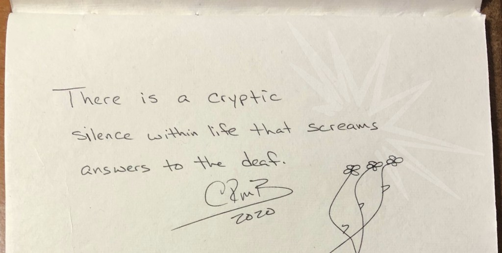Life · micro poem Cryptic 2020-03-192020-11-22 CandyH2O There is a cryptic silence within life that screams answers to the deaf. Share this: Click to share on X (Opens in new window) X Click to share on Facebook (Opens in new window) Facebook Like Loading... Related Published by CandyH2O Author/Writer, FreeThinker, Veteran 🇺🇸 USN Intelligence, Warrior, Dog lover, and just for fun, Watercolorist (hobby). View all posts by CandyH2O Share this: Click to share on X (Opens in new window) X Click to share on Facebook (Opens in new window) Facebook Like Loading...