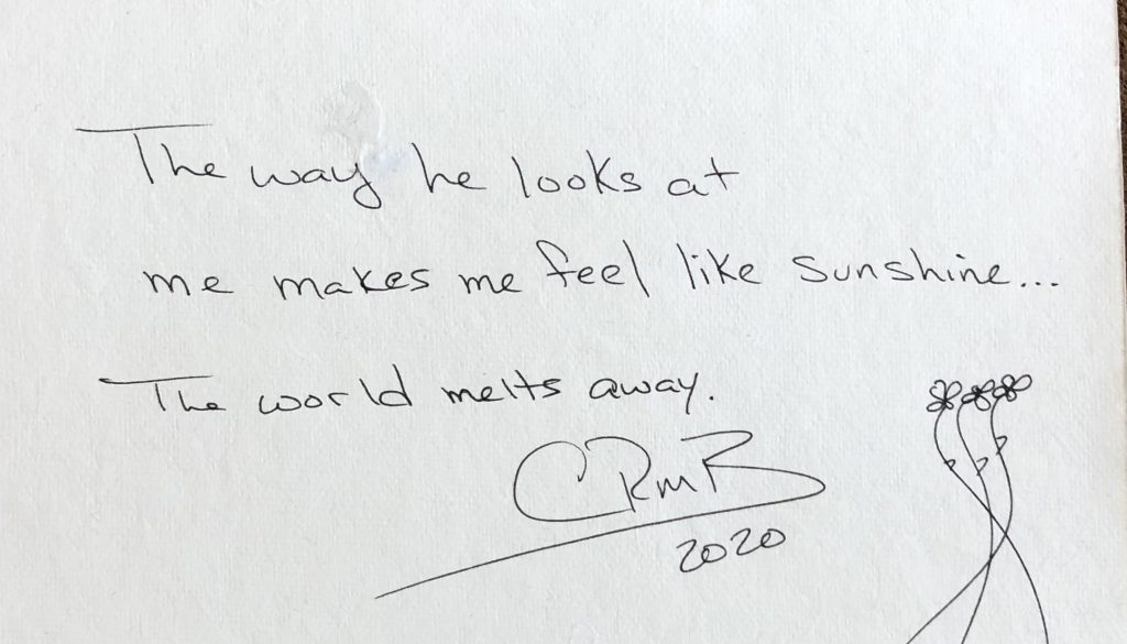 Love · micro poem Sunshine 2020-03-302020-11-22 CandyH2O The way he looks at me makes me feel like sunshine… the world melts away. Share this: Click to share on X (Opens in new window) X Click to share on Facebook (Opens in new window) Facebook Like Loading... Related Published by CandyH2O Author/Writer, FreeThinker, Veteran 🇺🇸 USN Intelligence, Warrior, Dog lover, and just for fun, Watercolorist (hobby). View all posts by CandyH2O Share this: Click to share on X (Opens in new window) X Click to share on Facebook (Opens in new window) Facebook Like Loading...