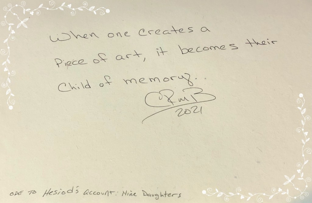 This micro poem is an ode to Hesiod’s account of Mnemosyne and Zeus’ Nine Daughters, the nine muses of the arts (if you will).