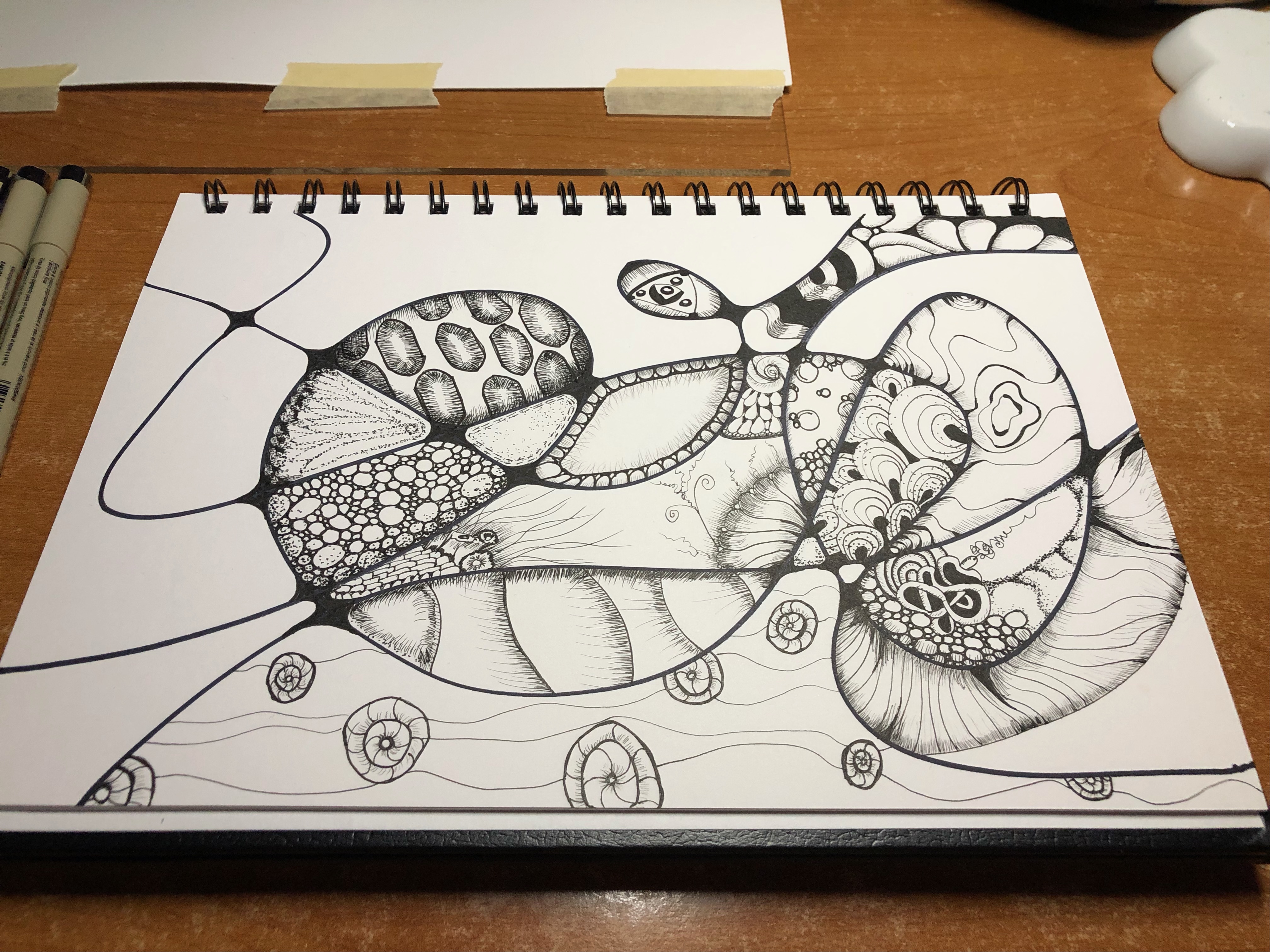 This is sort of a mix between neuropraphic art and zentangle. It was relaxing to sit back and just create sizes, shapes, shades…all of it. The only materials use were Micron pens (sizes 1, 2, 3, 5, and 8). The sketchbook paper is 90 lb white.