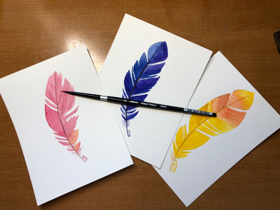 The feathers were painted on Canson 140 lb watercolor paper. You can see that it leaves hard edges in places. I also used two brands of watercolors, Holbein & Crafts4All; I don't recommend it because they did not blend or work that well together IMO. That said, they are still kinda' cute. The brushes used… Continue reading Watercolor – Feathers